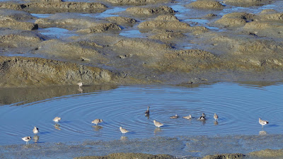 I'm spellbound catching glimpses through my binoculars of a small sampling of shorebirds and waterfowl congregated here – up to 20,000 individual birds feeding on invertebrates and milling about is not uncommon when the tide is out, food is abundant, and conditions are ripe.