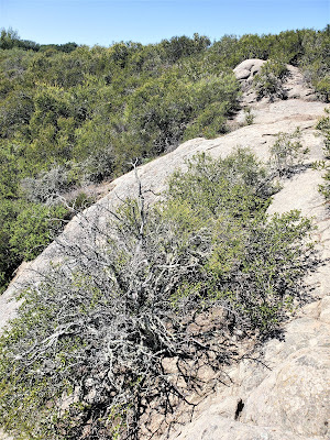 Our climb today begins with a steep switchback traverse up Chamise Trail, aptly named due to the preponderance of this tall flowering shrub keeping us company every step of the way, along with thickets of black sage releasing heaven-scented aromas; an occasional orange poppy popping up, and pretty bouquets of yellow monkeyflower; even the bunching stands of poison oak with their shiny green tripartite leaves add beauty to our environs.