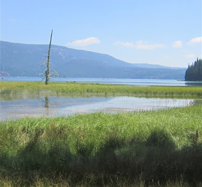 She points out a little known detail that takes a keen eye to make out – the whitish tip, barely discernible far across near the deepest point of the lake, of a dead pine tree, poking up just above the surface, bobbing there in the same place for a century, she says, held in place by an unknown force field.