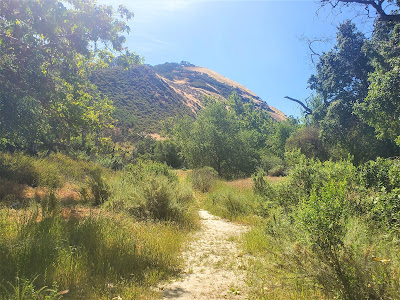 Soon, a Lazuli Bunting appears in the trees, enough to keep me glued to the spot, searching for more birds. Giving up on doing the climb (too hot, anyway!), I drop my bike and climb over the stile separating the watershed land from the public road and pick up a narrow trail and begin following it, to see where it might lead.